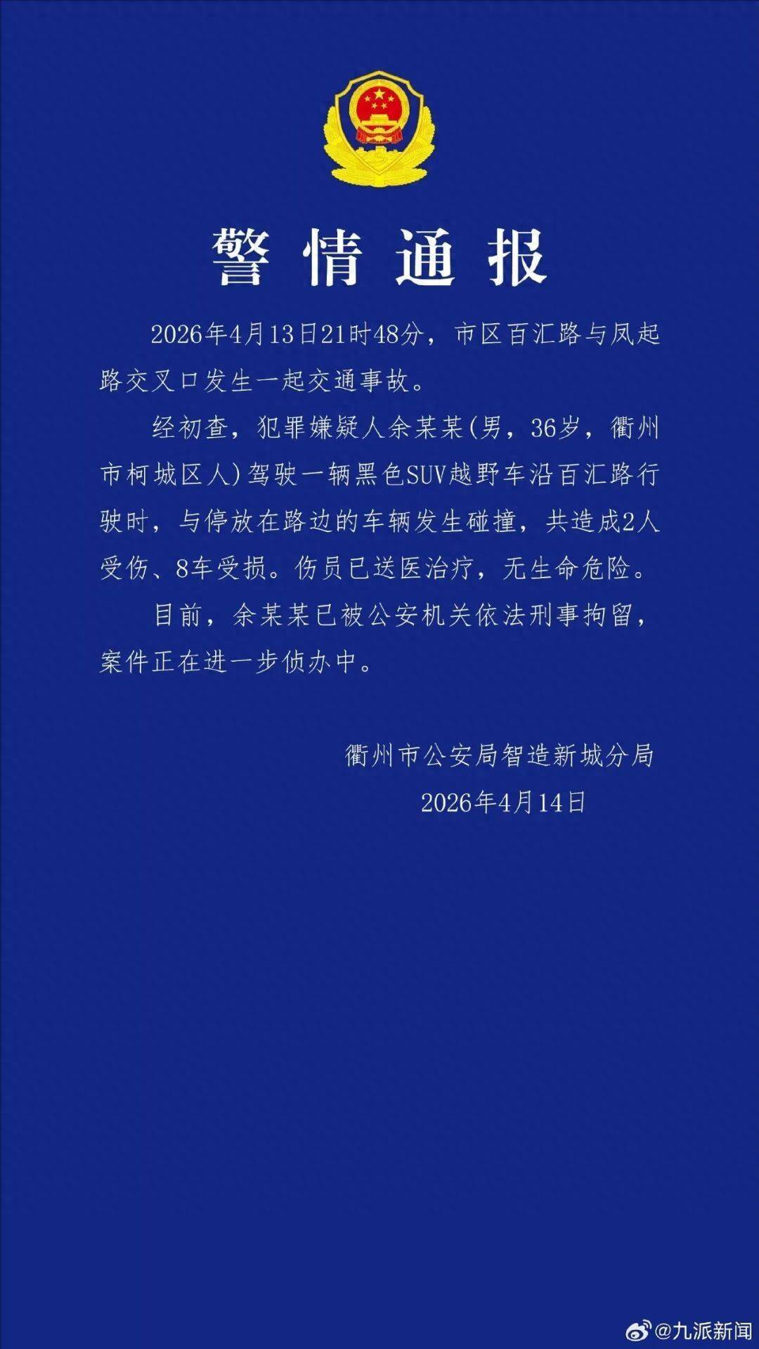 经初查,犯罪嫌疑人余某某(男,36岁,衢州市柯城区人)驾驶一辆黑色SUV越野车沿百汇路行驶时,与停放在路边的车辆发生碰撞,共造成2人受伤、8车受损。伤员已送医治疗,无生命危险。目前,余某某已被公安机关依法刑事拘留案件正在进一步侦办中。