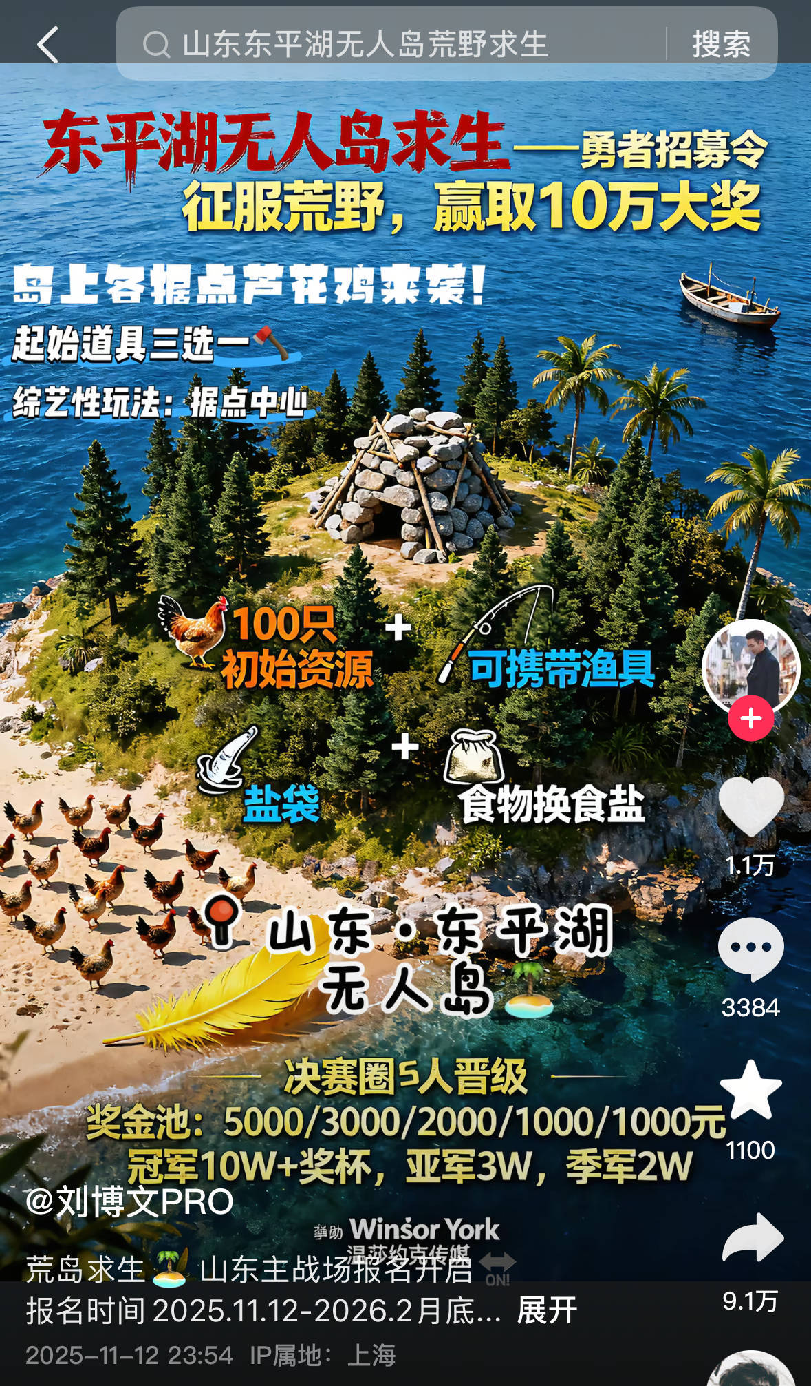 “征服荒野,赢取10万大奖,荒岛求生山东主战场报名开启!”11月13日,一则“东平湖无人岛求生勇者招募令”海报在社交平台引发关注。该海报显示,荒岛求生赛冠军、亚军和季军将分别获得10万元、3万元和2万元。报名者可携带渔具,岛上还会投放100只芦花鸡作为初始资源,参赛地点在泰安东平湖一处无人岛。